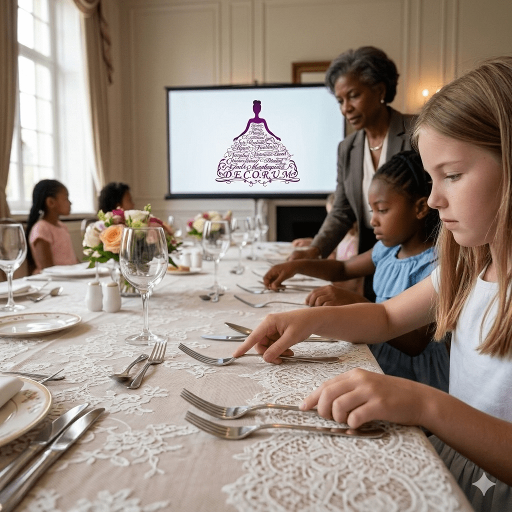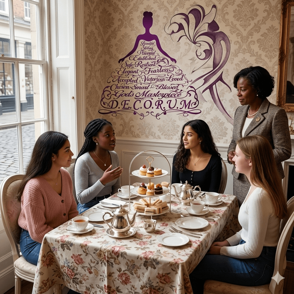 DECORUM is a faith-rooted etiquette and character development experience for girls ages 7–17, designed to cultivate dignity, self-respect, and inner confidence. Through a refined, school-style curriculum and purposeful mentorship—offered both virtually and in person—we guide young ladies to carry themselves with class, speak with intention, and move through the world Displaying Etiquette & Conscious Of Remaining Utmost Mannerly.